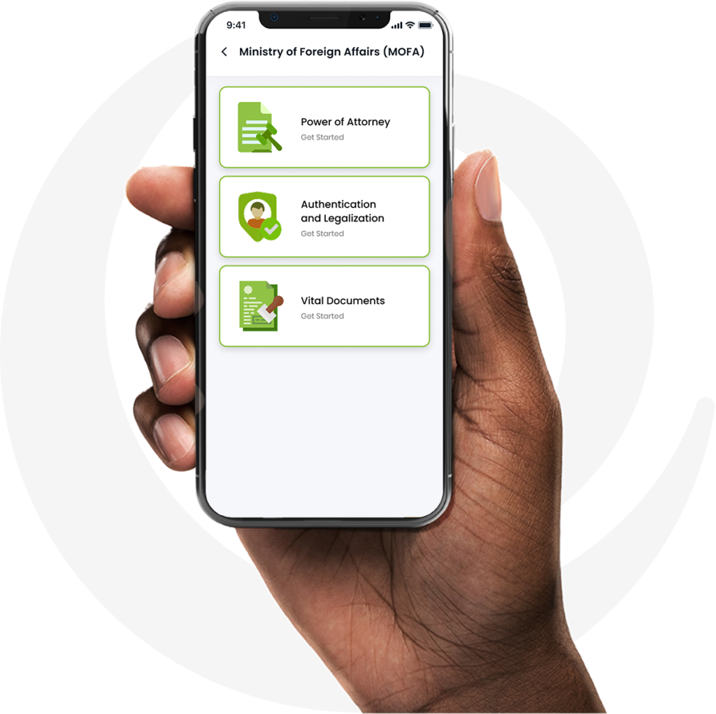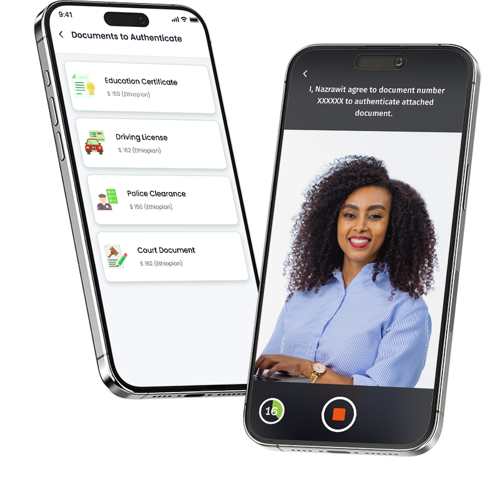 ደንበኞች በሀገር ውስጥ በኢትዮጲያ መንግስት በኩል ህጋዊነቱ የተረጋገጠ ሰነድን በውጪ ሀገራት ጥቅም ላይ ለማዋል በኢፌድሪ የውጪጉዳይ ሚኒስቴር ቢሮ በኩል ህጋዊነቱ ተረጋግጦ የሚያፍበት ሂደት ነው። አገልግሎቱን ለማግኘትም መተግበሪያውን በማውረድ አካውንት በመክፈት የሚጠየቁትን መጠይቆች ከሞሉ በሗላ ህጋዊነቱ እንዲረጋገጥ የሚፈልጉትን ሰነድ ስካን በማድረግ ያስገባሉ:: ቀጣይ መጠይቆችን በመሙላት ያጠናቅቃሉ በመጨረሻም ያስገቧቸውን ሰነዶች ትክክለኛነትና ህጋዊነት በኢፌድሪ የውጪጉዳይ ሚኒስቴር ቢሮ በኩል ህጋዊነቱ ተረጋግጦ በሚኖሩበት ሀገር አድራሻ ከ24-48 ሰዓታት ውስጥ ይላክሎታል!