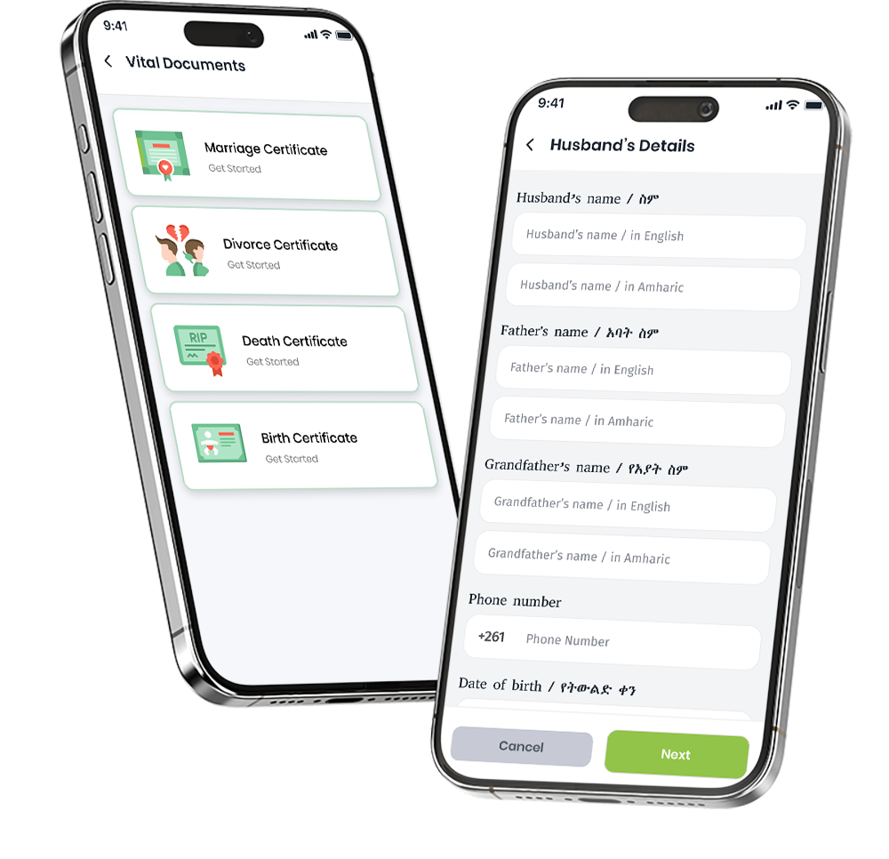 የሕይወትዎን በጣም አስፈላጊ ሰነዶች በቀላሉ ለመቆጣጠርና ለማረጋገጥ በመተግበሪያችን የተዘጋጀውን የወሳኝ ሰነድ አገልግሎት ተጠቀሙ። የጋብቻ፣ የፍቺ፣ የትውልድ ወይም የሞት ማረጋገጫ ቢያስፈልግዎትም መድረካችን ሁሉንም ሂደት ከጀማሪ እስከመጨረሻ ቀላል እንዲሆን ተዘጋጅቶ ነው። ቀላል የሆነ ተጠቃሚ ገጽታ፣ እርስዎን የሚመራ መመሪያዎች እና የተረጋገጠ ዲጂታል እንክብካቤ በመጠቀም አስፈላጊ ሰነዶችን በቀላሉ በፍጥነት ማግኘት ይችላሉ። ግባችን የተሻለ እና ዘመናዊ መፍትሄ በመስጠት፣ የሚያስፈልጉትን የወሳኝ ሰነድ ሂደቶች በቀላሉ በእርግጥ እንዲጠናቀቁ ማድረግ ነው፤ እናም ይህን ሁሉ በመሣሪያዎ ላይ እንዲፈጽሙት የተዘጋጀ ነው።